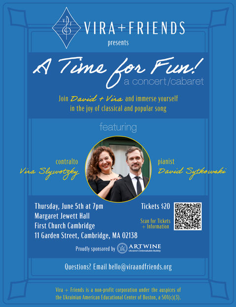 Vira Slywotzky founded Vira + Friends in May 2018 with the intent of bringing people together to enjoy the live performance of music written for voice and piano. Since that time Vira + Friends has become a multiform concert series with the expanded missions of developing audiences for classical music and providing a platform for composers traditionally neglected by the Western canon. Vira + Friends thrives on partnering with organizations such as the Billion Oyster Project and Razom for Ukraine, promoting their work and fundraising for them through themed concerts. Two exciting developments of the past year include the launch of a long term international project presenting the works of women composers past and present and the formation of the Ukrainian Music Initiative. Vira + Friends is a nonprofit corporation under the auspices of the Ukrainian American Educational Center of Boston, a 501(c)(3).